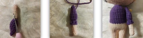 Pasar la aguja a través del cuerpo, luego atravesar el brazo, insertar 3 filas más abajo y pasar nuevamente la aguja por el cuerpo hasta el otro brazo