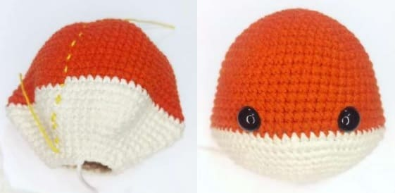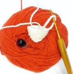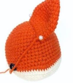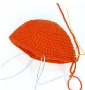 Teje 3-4 pb adicionales para terminar de tejer en la parte de atrás en el medio de la cabeza. Sujete el hilo, deje unos 60 cm para bordar puntadas decorativas en la frente. Rellene su cabeza con fuerza.