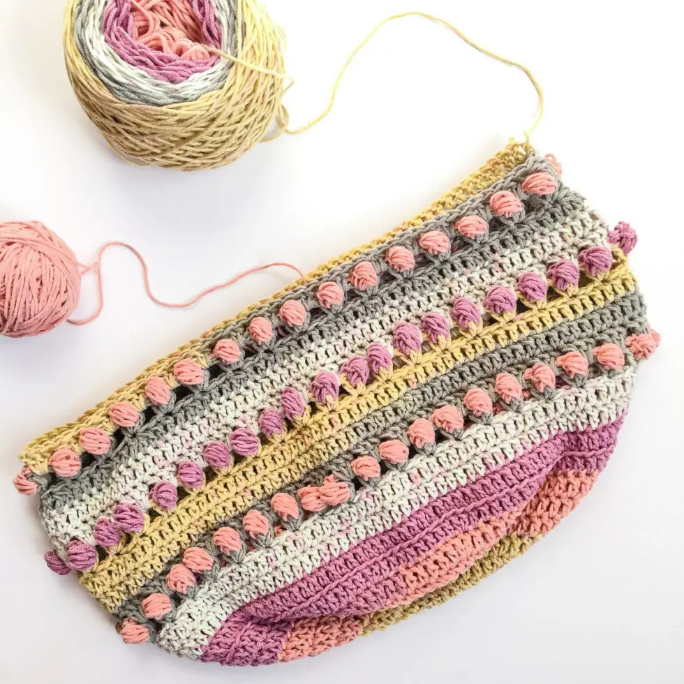 - Opcional: para todas las vueltas de Puff Stitch de Flor, usé el extremo del ovillo para asegurarme de que los puffs fueran de un color diferente a las vueltas de grupos de puntos altos.
