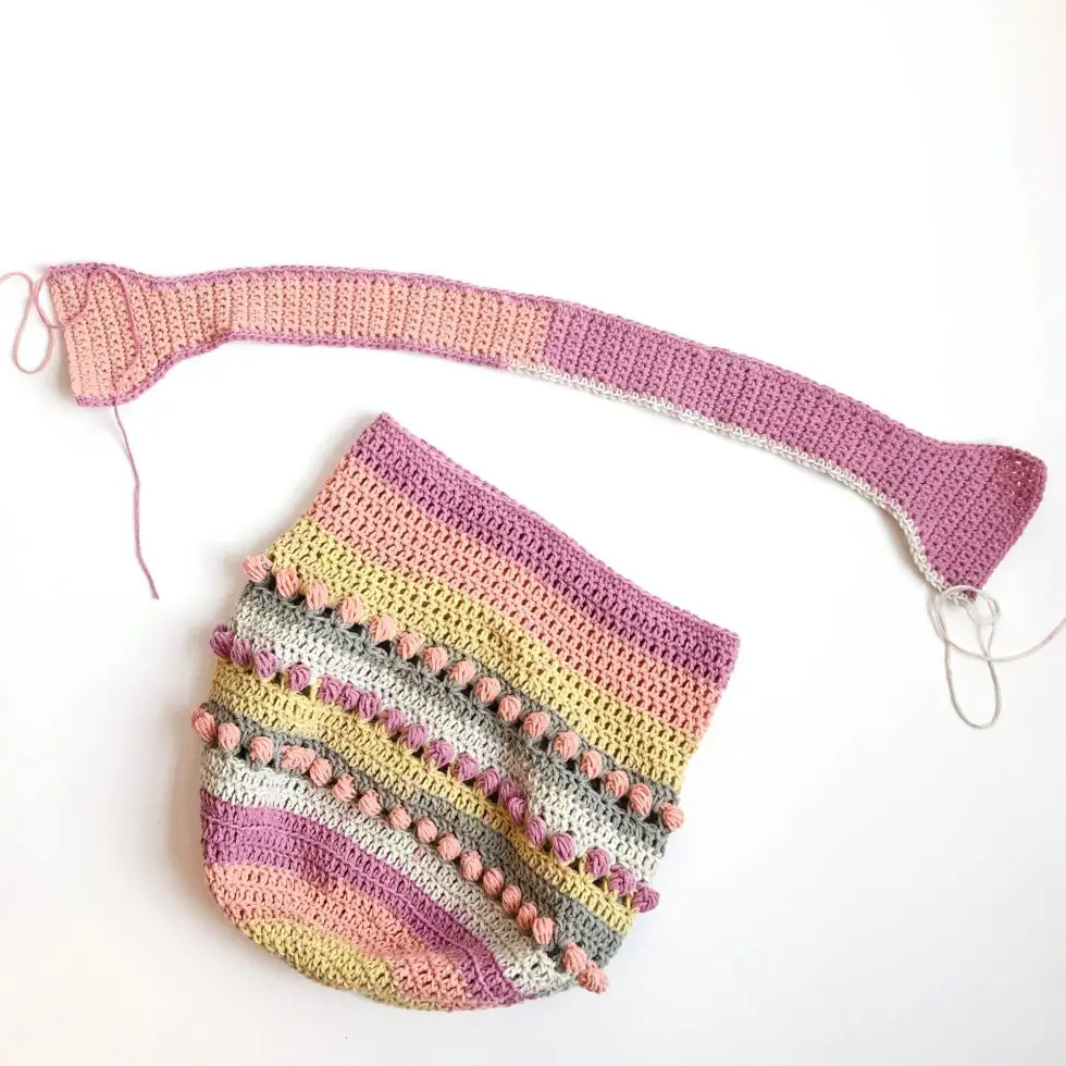 - Nota: si se está tejiendo el bolso con 3 colores diferentes de hilo, cambiar al color C.