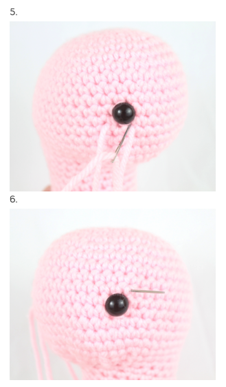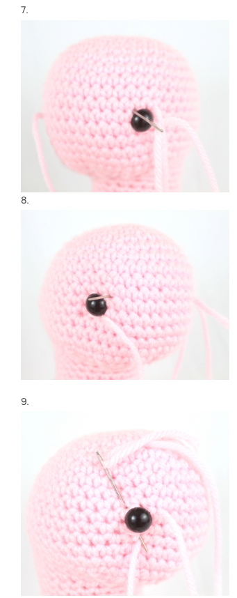 Con aguja e hilo del color principal, pasa el hilo alrededor de los ojos siguiendo un recorrido en zigzag para crear pequeñas hendiduras. Ajusta con cuidado y anuda firmemente sin tensar demasiado.