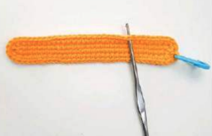 1ª vuelta: Empezar a tejer en la segunda cadena desde el gancho, hacer 1 aum, 29 pb, 4 pb en la última cadena. Girar la pieza y continuar tejiendo en la otra cara de la cadena base: 29 pb, 1 aum en los últimos 2 puntos (66 pb en total).