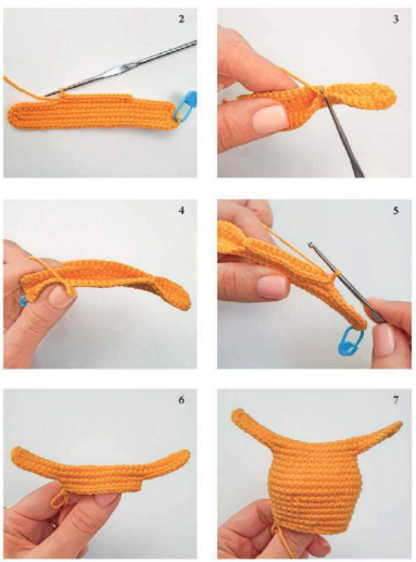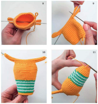 - Contar 11 puntos desde el final de la 2ª vuelta y unir el hilo amarillo en el punto 12. Comenzar a tejer la base de los ojos.