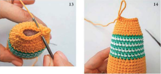 Cerrar con aguja lanera, pasando el hilo por los puntos restantes y tirando suavemente para cerrar la abertura. Esconder la hebra en el interior.