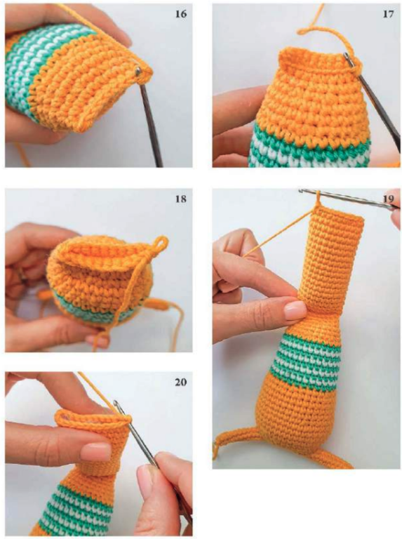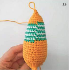 Hacer 1 pd en el siguiente punto, cortar la hebra dejando un extremo largo para coser y esconder la hebra en el interior.