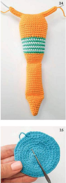 Colocar la primera pieza de la concha sobre la segunda y unirlas usando la hebra trasera de la 9ª vuelta. Ir rellenando con fibra sintética a medida que se cose la concha.
