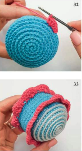 Usando hilo rosa, unir el hilo en la hebra trasera de la 9ª vuelta, y tejer alrededor de la concha.