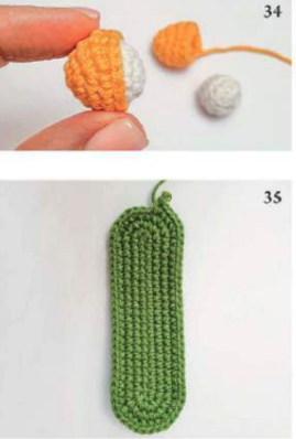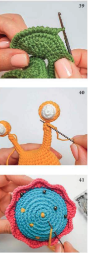📌 4. Con hilo verde, coser la hoja en la parte inferior del caracol, asegurando que el lado derecho quede hacia afuera. La figura final podrá sostenerse de pie por sí misma, así que fija la hoja con alfileres antes de coser para encontrar la mejor posición. Utiliza la fila 4 de la hoja para la costura.