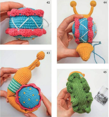📌 3. Usar hilo azul para coser la concha al cuerpo, asegurando que quede bien sujeta a la parte trasera, la parte inferior y la cola del caracol.