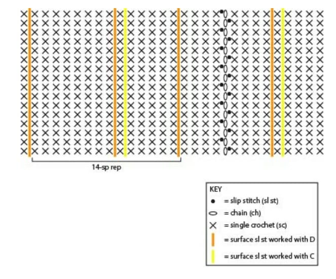 Desde la derecha, empezar en la primera vuelta del lado y trabajar en el sentido de las agujas del reloj, saltar 3 espacios después de la unión de pr. Con D, trabajar la línea de pr en la superficie con D, trabajar una línea de pr verticales en los espacios entre los puntos de la fila 1 a la 37 del lado desde la fila 1 hasta la 37. Continuar de esta manera, siguiendo el gráfico para trabajar las líneas verticales restantes de puntadas superficiales.