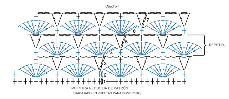 2.ª hilera: 3 cad. 1 pa en el primer pb. *2 cad. Saltar los siguientes 4 pa. 1 pb en el siguiente pa. 2 cad. (1 pa. 1 cad. 1 pa) en el siguiente pb. Repetir desde * hasta el final de la hilera, terminando con: 2 cad. 2 pa en el último pb. Girar.