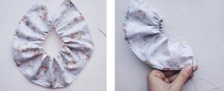 Recoge la tela formando la falda hasta que coincida con la circunferencia del cuerpo de la oveja usando este hilo.