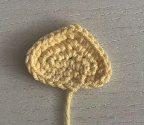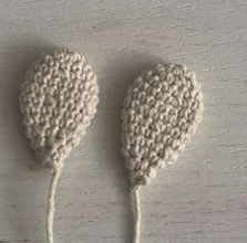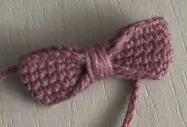 Hacer 30 pb. Unir la cadeneta en un anillo. Tejer en redondo 5 vueltas de 30pb. Luego tejer por separado una cadeneta de cad, probar en la cabeza de su patito. Colocar la cadeneta de cad sobre el lazo y enrollar por el medio del lazo con hilo. Rematar el hilo, cortar y esconder.