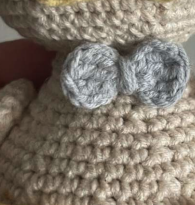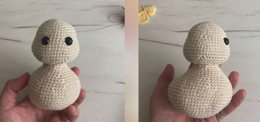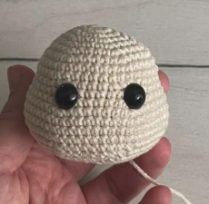 Rellenar con relleno, dejar hebra para coser. Insertar los ojos entre las vueltas 11 y 12 a una distancia de 7 pb de las patas de los ojos.