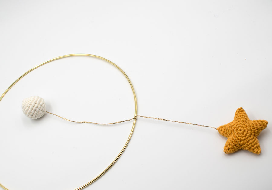 La distancia entre aro y bola debe ser igual en todos los hilos (aprox. 16 cm) para equilibrar el móvil.