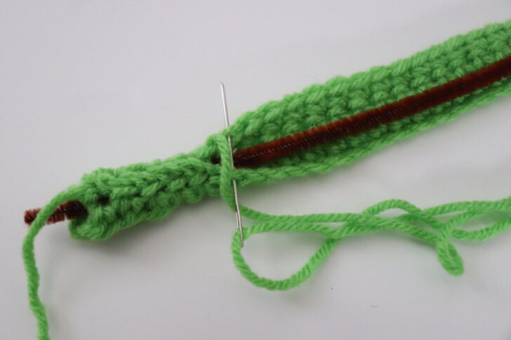 💐 Con tu aguja lanera, cose alrededor del limpia pipas con la pieza del tallo. Asegúrate de coser alrededor de la parte inferior para que el limpia pipas no sobresalga.