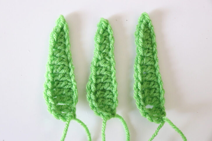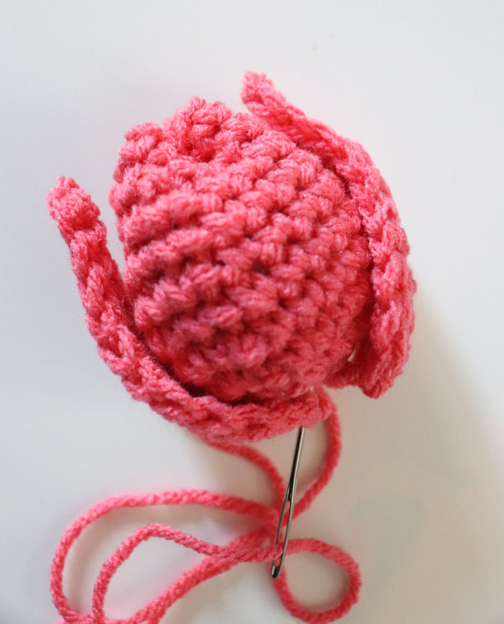 Haz 13 cadenetas, desliza en la 2ª cadeneta desde el gancho, punto bajo en el siguiente, medio punto alto en los siguientes 3, punto alto en los siguientes 3, punto triple en los siguientes 3, punto alto en el último + haz 2 cadenetas para unirte de nuevo a la última cadeneta. Termina y corta. Cose a la vara o tallo.