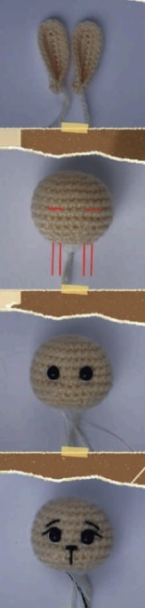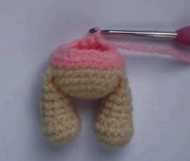 5️⃣ Coser las orejas en la fila 3 de la cabeza.