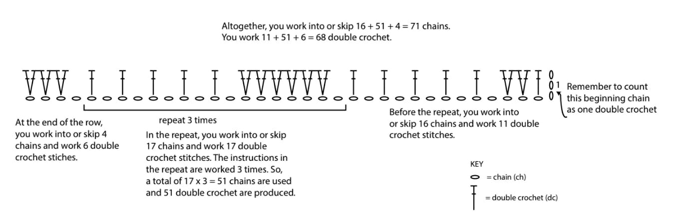 La manta está hecha en un patrón de ondulación que consiste en filas de “picos” y “valles” de ganchillo a crochet que se alternan con hileras de ganchillo simple. Es posible que tengas que trabajar varias filas antes de que la ondulación sea claramente visible.