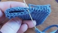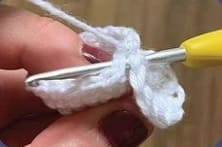 V 1: Comienza con 12 cadenetas, salta 1 cadeneta, realiza 9pb, aum, gira, continúa del otro lado de la cadeneta con 10 pb (22)
