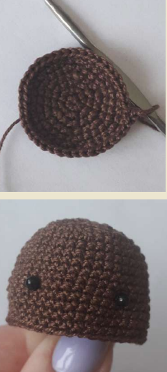 Coloca los ojos de plástico entre la 12ª y 13ª fila (9 puntos de separación entre los ojos) - (3 pb, dism)* 6 (24)