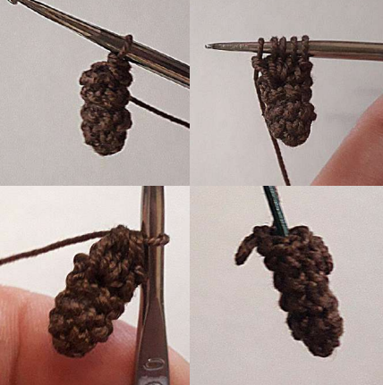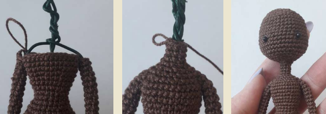 - 9 pb (pierna 1), 6 pb (en la hebra frontal de la cadeneta), 9 pb (pierna 2), 6 pb (en la hebra trasera de la cadeneta) (30)