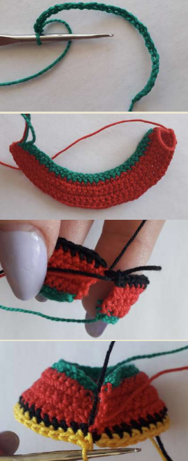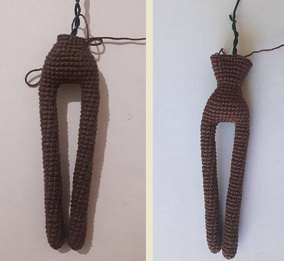 3-5. 9 pb. Inserta el alambre en la pierna y continúa tejiendo, rellenando gradualmente la pierna.