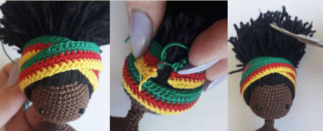 Toma el estambre negro (YarnArt Jeans u otro estambre 50g/160m) y córtalo en trozos iguales (aprox. 12.5 cm). Cose cada mechón de cabello con hilo, como se muestra en la foto.