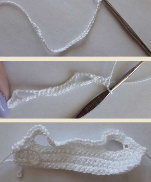 - Desde la segunda cadeneta desde el gancho tejemos 4 pb, 5 cad, salta 6 cadenetas, 10 pb, 5 cad, salta 6 cadenetas, 4 pb (28)