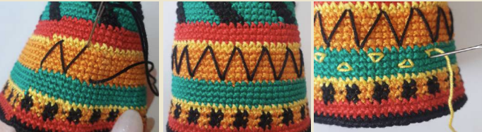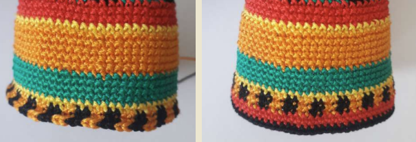 Borda líneas negras en la franja naranja y triángulos amarillos en la franja verde.