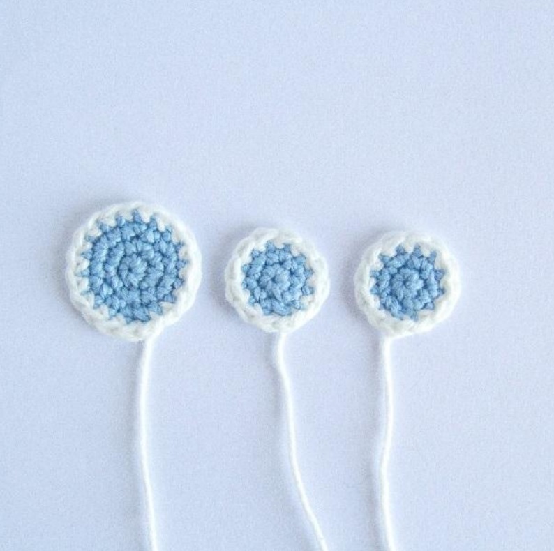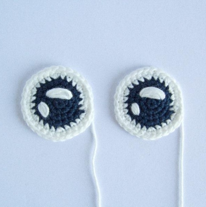 Con hilo blanco, borda los reflejos en los ojos. Cose los ojos al cuerpo, entre las vueltas 25 y 35, alineados con dos tentáculos y separados por unos 10 puntos.