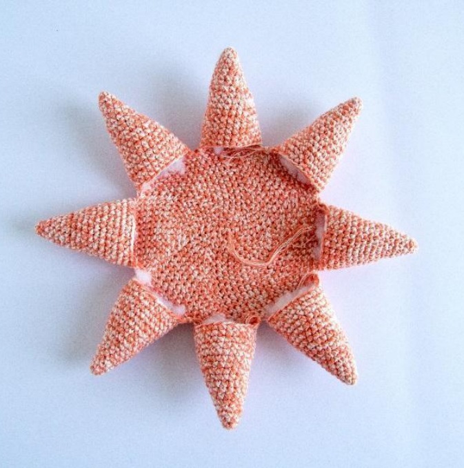 Cose la vuelta 5 con la cadena de base para cerrar rellenando al mismo tiempo. Cose la boca entre los ojos, entre las vueltas 26 y 31. Puedes dejarla en forma redonda o ponerla en forma sonriente/triste.