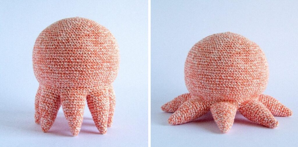 Empieza a rellenar el cuerpo firmemente y continúa haciéndolo mientras tejes. Asegúrate de que la parte de abajo del pulpo no se abulte por el exceso de relleno, sino que quede metida en el cuerpo.