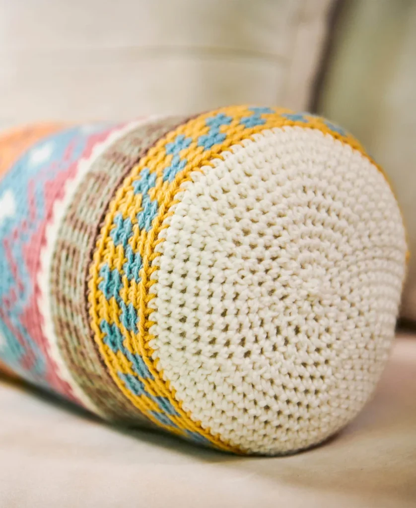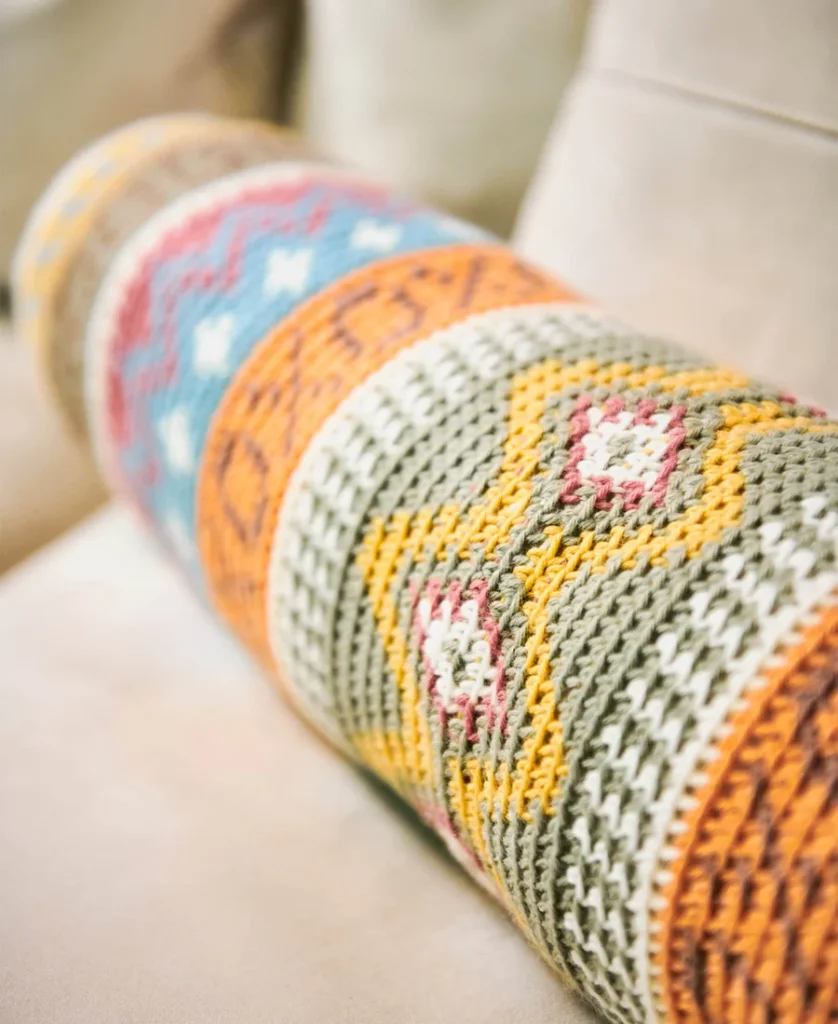 La Almohada Bohemia Lumbar no es solo un accesorio decorativo; es un alivio para tu espalda con estilo, echo por tus manos. Al tejer este patrón en punto tapestry, tienes la oportunidad de fusionar colores vibrantes y figuras geométricas que darán vida a ese sofá o habitación que necesita un toque especial 🏠✨. Sumergirte en este proyecto te permite desconectar del estrés diario mientras ves cómo, punto a punto, nace una pieza con textura rica y un diseño visualmente impactante que grita «boho-chic».