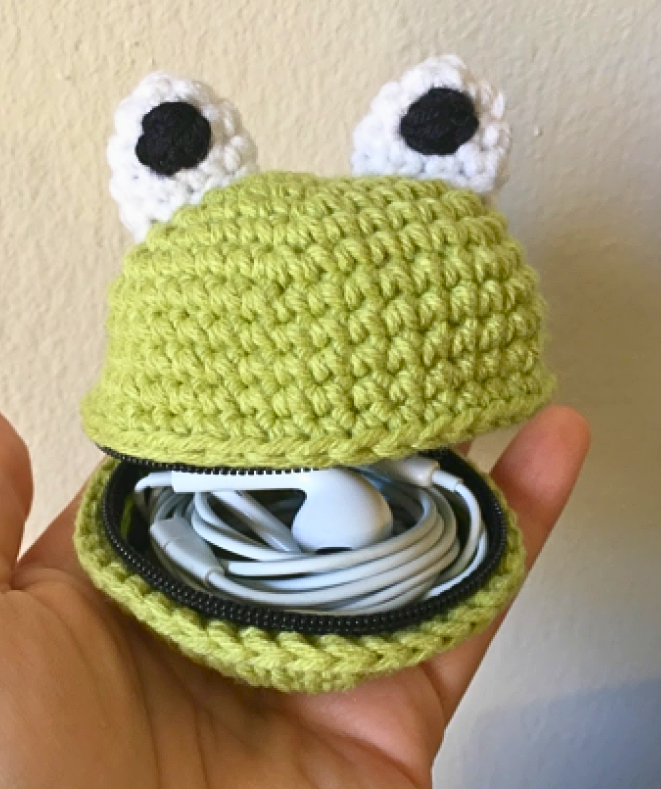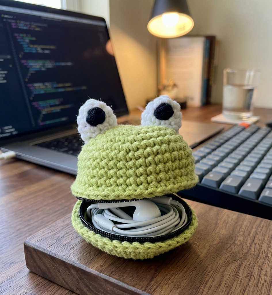 Esta pequeña bolsa con forma de ranita te permite guardar auriculares, monedas o pequeños accesorios. Sigue este patrón paso a paso para crearla fácilmente.