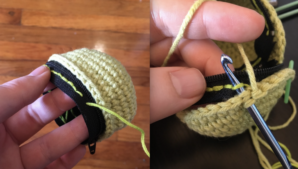 Inserta el ganchillo en el punto del tejido y en el punto de la cremallera al mismo tiempo.