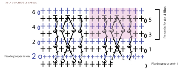 Fila 1 (LD): trabaja en patrón sobre 21 (25, 29, 32, 36) (40, 43, 47, 51) pts, pb2juntos, pb, girar.