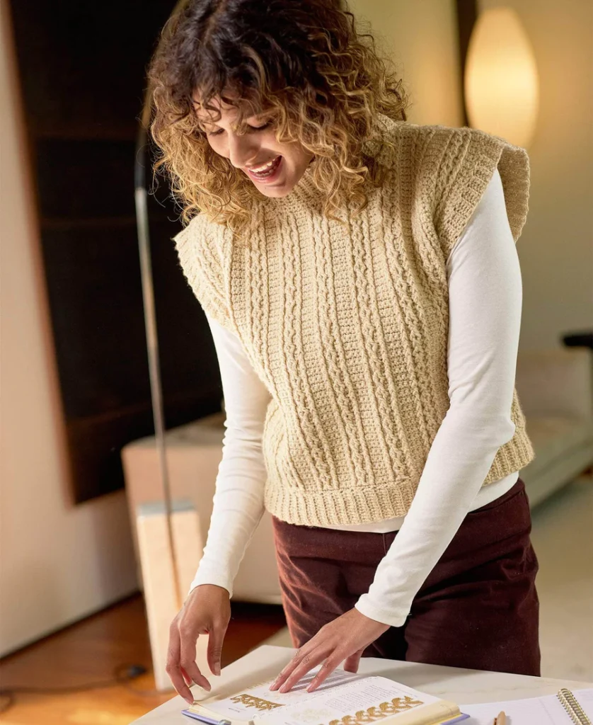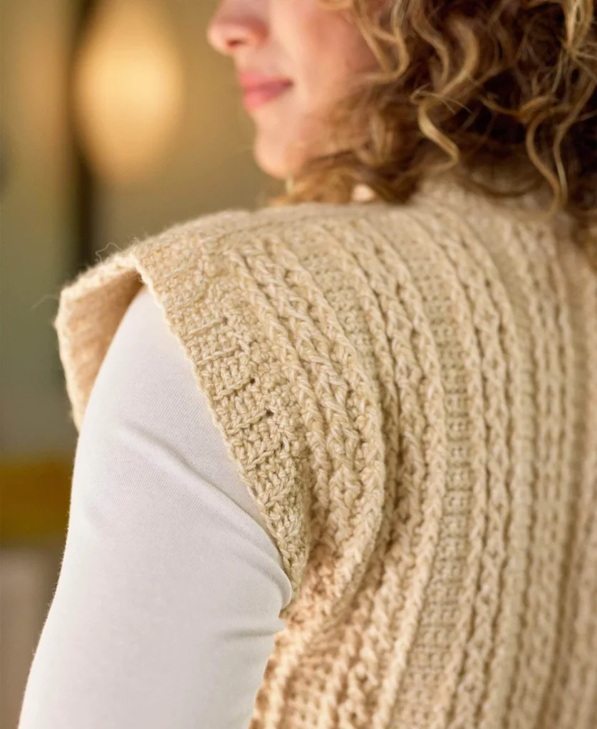 El Chaleco Cristina es la definición de la elegancia casual de transición. Inspirado en el diseño clásico de punto, este chaleco de crochet logra una textura rica y estructurada gracias al uso inteligente de puntos en relieve que imitan las trenzas y las costillas verticales de la costura tradicional. Su corte moderno y su cuello alto (o cuello chimenea) no solo brindan una calidez sofisticada para esos días frescos, sino que también enmarcan perfectamente el rostro. Confeccionado en un sereno tono beige natural, el diseño es atemporal, ideal para llevarlo sobre una camisa o una camiseta de manga larga. Es una prenda que combina la comodidad del tejido a mano con una silueta contemporánea, elevando instantáneamente cualquier look de invierno o entretiempo.
