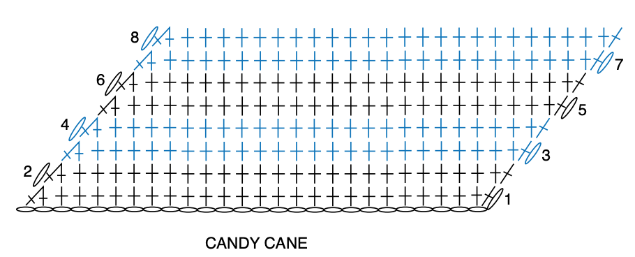 Nota: Para cambiar de color, trabaja hasta que queden 2 lazadas en el gancho con el color anterior. Haz una lazada con el nuevo color, pasa por las 2 lazadas y continúa con el nuevo color.
