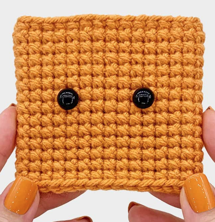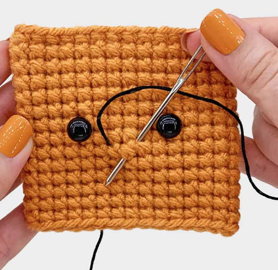 Antes de continuar con las siguientes vueltas, sigue las instrucciones para colocar los ojos y bordar la boca del pino amigurumi.