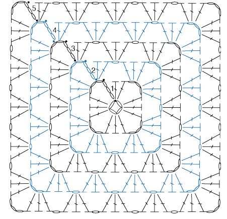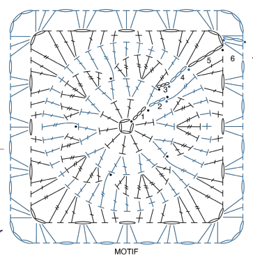 Vuelta 6: Hacer p.d. en el siguiente esp-2-cad. Hacer 2 cad (no cuenta como punto). 1 mpa en el mismo esp-2-cad. 3 cad. 3 mpa en el mismo esp-2-cad. 1 cad. *(3 mpa. 1 cad) en cada esp-1-cad hasta el siguiente esp-2-cad de la esquina. **(3 mpa. 3 cad. 3 mpa) todo en el siguiente esp-2-cad. 1 cad. Repetir desde * dos veces más, luego desde * hasta ** una vez. 2 mpa en el primer esp-2-cad. Unir. Finalización: rematar