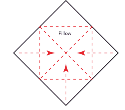 - Para formar un Cuadrado: Con el lado revés de frente, doblar 3 esquinas para que se encuentren en el centro, como se muestra en el diagrama, para formar un cuadrado.