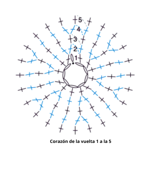 V 1: Unir el color A con pe al primer pb sin trabajar. 1 pb en cada uno de los siguientes 12 pb. Unir con pe al primer pb.