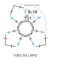 Con color A, tejer 8 cad. Unir con pe para formar un aro, dejando una hebra larga de aprox. 15 cm.