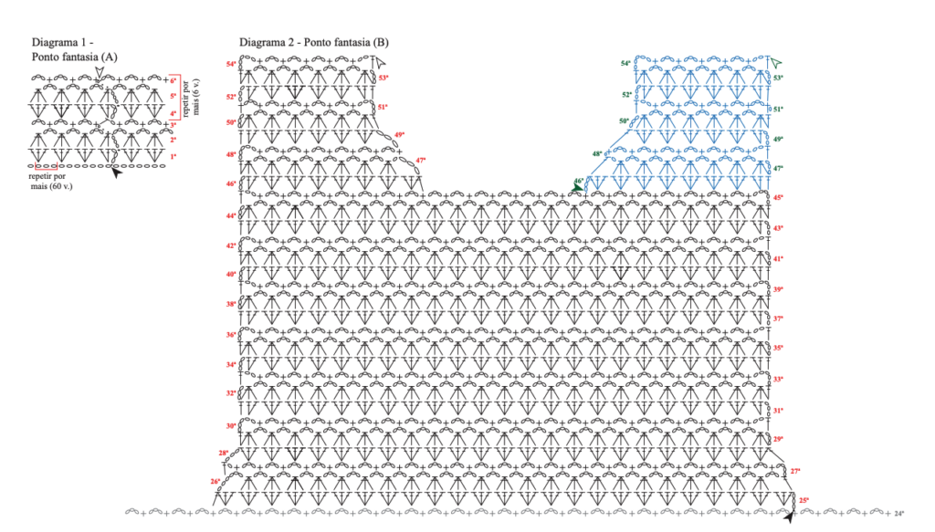 Sobre esta base, trabajar en punto patrón (A) siguiendo el diagrama 1, repitiendo el motivo desde la vuelta 1 hasta la 24.