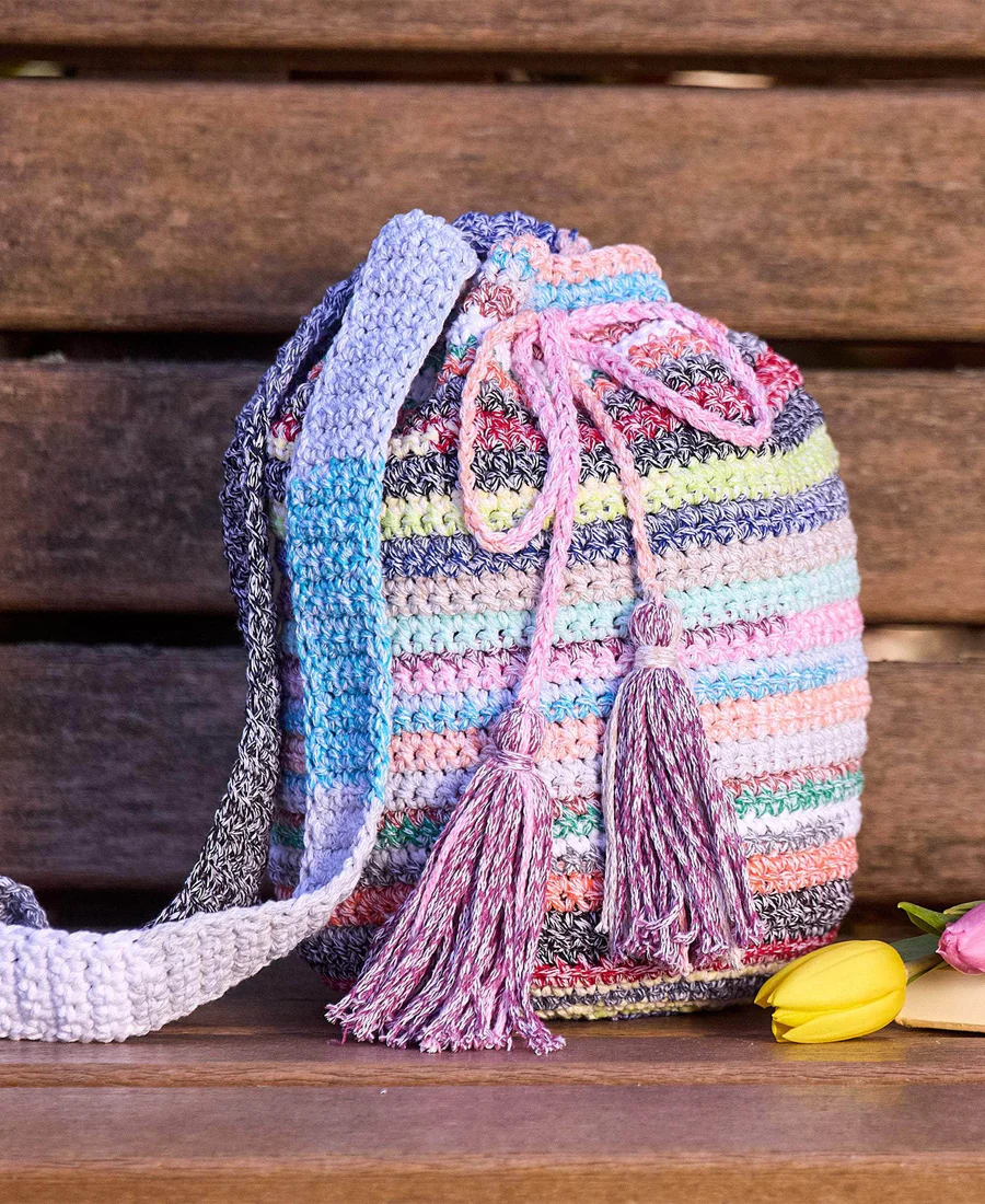 Este bolso se teje en una sola pieza de abajo hacia arriba, creando un diseño a rayas con cambios de color.