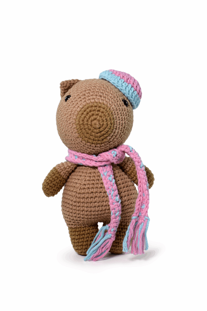 ¡Conoce a Tita la Capibara, el amigurumi más adorable y relajado que tejerás! Este proyecto es perfecto para ti si estás dando tus primeros pasos en el mundo del amigurumi, ya que combina formas sencillas con el encanto de un personaje único. Tita, con su sombrerito rosa y su bufanda a juego, te invita a un viaje de tranquilidad y creatividad. Tejerla no solo te permitirá practicar los puntos básicos del ganchillo, sino que te dejará con un resultado tierno y lleno de personalidad.