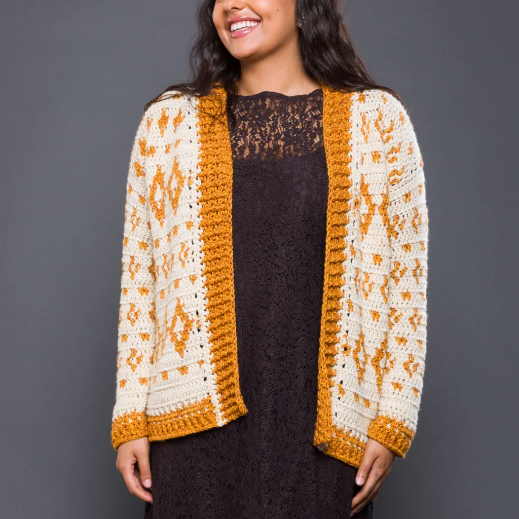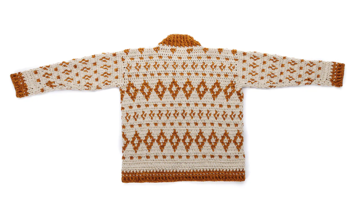¿Estás lista para elevar tu nivel de tejido con una prenda que parece sacada de una boutique de lujo? El Cárdigan Mosaicos de Crochet es la respuesta definitiva para quienes buscan una pieza de abrigo con estructura, carácter y un diseño visualmente impactante. 🧥✨ Este cárdigan no solo destaca por su calidez, sino por su intrincado patrón de diamantes y motivos geométricos que juegan con el contraste entre el crema y el ocre, creando un efecto de mosaico clásico pero totalmente renovado. Es la prenda perfecta para esos días frescos donde quieres lucir sofisticada sin perder la comodidad de lo hecho a mano.