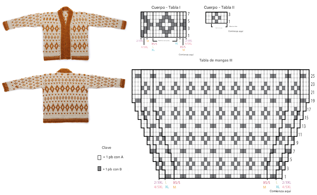 Luego, continuar trabajando el patrón combinado de colores según secuencia indicada (repetición de 16 filas) hasta que la pieza mida aproximadamente 52 cm desde el inicio, terminando en fila correspondiente del patrón.