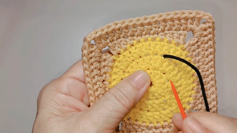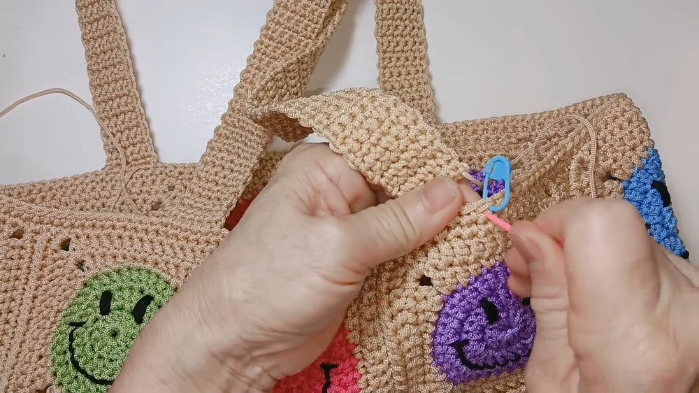 Una vez completados los cuadrados, se unen cuidadosamente con puntadas deslizadas o puntadas de látigo para formar el cuerpo del bolso.